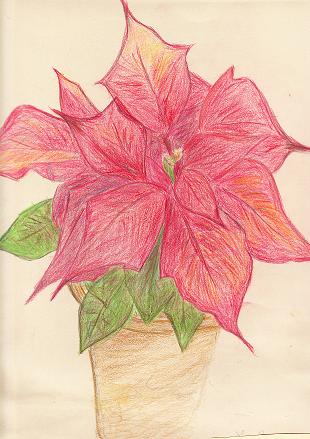 で、ポインセチアの図、です。ホントはもっと濃い色なんですけど、スキャンするとこんな感じ^^足りないんですよ、紙が。